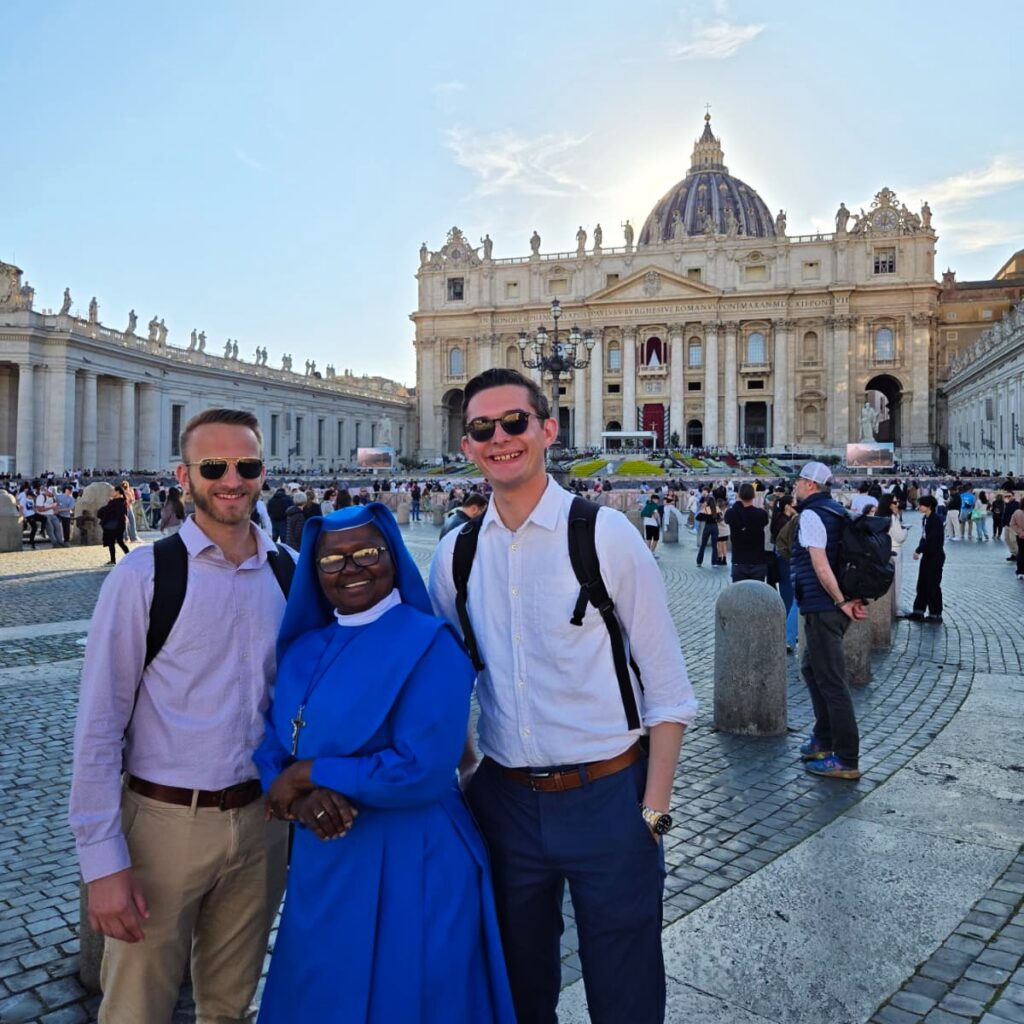 We began our day by walking along the Appia Antica, the oldest highway in the world. We saw the tomb of the Roman Senator Seneca. We then visited the famous catacombs of St Sebastian and St Callixtus. This was a very solemn and unique experience.Friday, May 27: The group has arrived in Rome and posed for a photo in Saint Peter’s Square.